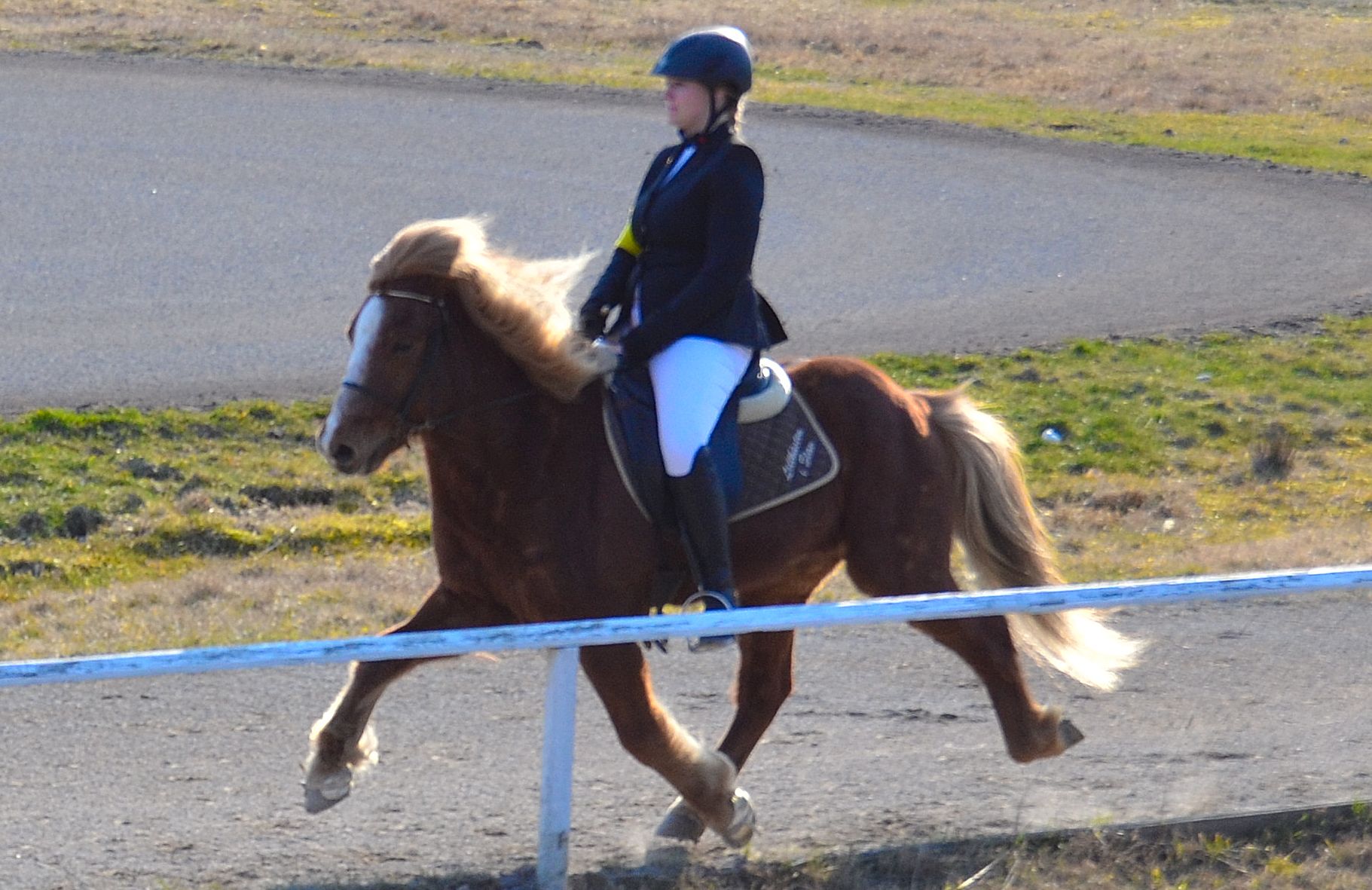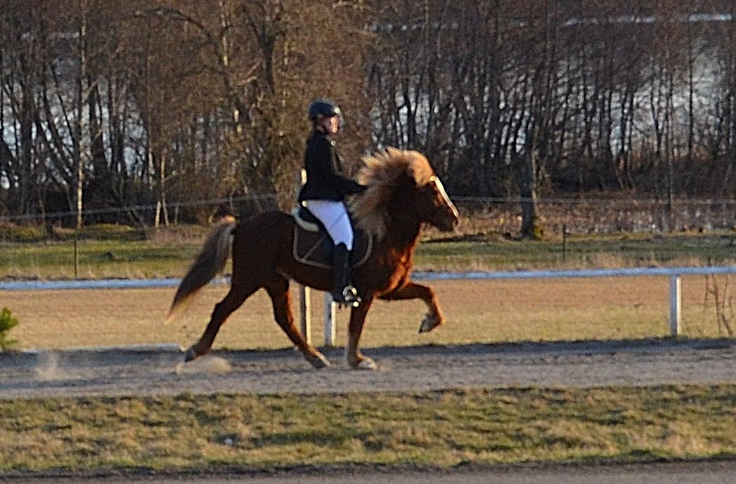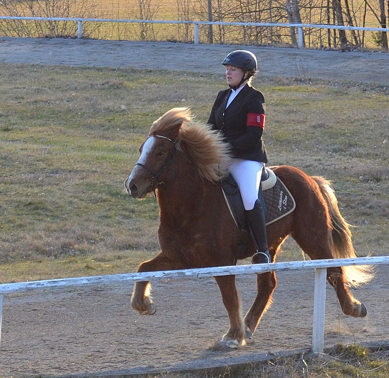 Nåja, den då ”bra och förberedde” herr Bliki firade vårens ankomst genom att ta bettet och dra som en avlöning över hela stallplan häromdagen då hans ryttare tyckte att hon behövde träna en passläggning inför helgens start. Nu har vi i samförstånd (ibland måste man få göra sina egna misstag innan man lyssnar på sin kära mor), kommit fram till att just Bliki inte ska tränas i pass särskilt ofta och framförallt inte på sista sträckan hem, där proppskåpet på sagda djur tenderar att få kortslutning och han kommer studsandes på tvären över stallplan med en väldigt arg ryttare på ryggen. Har hänt mer än en gång. Eftersom jag ogärna ville att han skulle ha just den ritten i åminne, när han skulle beträda tävlingsbanan, satte jag mig på honom dagen efter och ägnade mig åt nedsåsning av häst. Det är jag bra på. Tur man är bra på något. Vi la tre läggningar inne på volten, stillsamt, långsamt och han fick massor av godis i nedtagningen. Han kändes för övrigt bara urtrevlig att rida (nu på tränsbett, som jag känner mig mer hemma på. Han var nöjd, bakbenen var med, jag var nöjd.) Han hade väl liksom fått pysa av sig dagen innan, så nu fanns det inget av stollande kvar i honom. På tävlingsdagen var han lite spänd och ganska framåt i femgången, sprang lite fort i trav och skritt (svaga rollinslag samt lite överilad skritt), tölten godkänd och galoppen fin. Läggningarna var jag stennervös inför. Sist vi tävlade honom drog han i ALLT, ha la sig inte en gång utan startade i pass, inte i galopp, slog upp i kors i kurvan och skenade igenom läggningarna i korsgalopp. I T3 lydde han i två av nedtagningarna, sedan lackade han ur och drog hela den sista kortsidan och sedan i alla varv i det ökade. Inget bra tävlingsminne. Just därför var hela målet med denna start att han skulle vara lugn och kontaktbar (dvs kontrollerbar). Poängen var helt ointressanta, för är han inte lugn blir det ändå bara en rysk roulette där slumpen avgör om det blir nertagningar alternativt pass och där vill vi inte hamna. Nu fick Emmy honom i galopp innan läggningarna, alla 3! Väldigt bra. Första läggningen rollade han mycket i, så hon höll tillbaks honom ordentligt. Läggning två ville ha inte söka passen så hon lät honom rulla hela vägen i stillsam galopp, utan att bråka. Tredje läggningen la han sig, men hon drev inte alls för att undvika att han skulle varva upp sig. Pass vet vi att han har, en grym sådan dessutom, så det behöver vi inte kolla av.