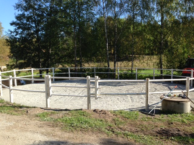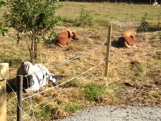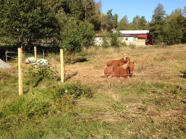 Tor och Leiri tycker det är mer spännande att undersöka gruset än att beta. Överhuvudtaget ägnar hästarna mycket tid åt att inte beta, det är också ett gott tecken tycker jag. De är mätta, nöjda och nyfikna. Den fula lekstugan till vänster är numera ett minne blott. Ett minne jag gärna förtränger. Alla små fula byggnader jämnas med marken och kvar får de som tillför något vettigt vara.