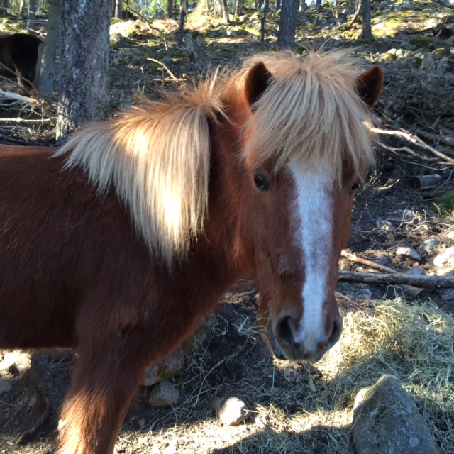 Två underbara, röda rumpor i vårsolen – Klár och Snurre hugger in på lunchen. Fortfarande får jag ett lyckopirr i magen när jag lufsar runt och pillar med hästar, hösilage och hagar. Dock blir livet på landet lite väl snurrigt ibland. Strax innan lektionerna skulle börja igår såg jag från arbetsrummet en shetlandsponny passera genom gården i full kareta. Grannen har nyss tagit hem sina två shettisar och den största anledningen till att INTE ha shettis i min värld är att de alltid rymmer. Just det. Jag älgade efter, men såg inte ett spår efter den lilla knubbiga fuxen. Hästarna i mina hagar stod och vrålblängde efter det röda troll som nyss passerat. (Klárs stämma hördes här han skrek ”ha, ha Snurre det såg ut som du, lika tjock och lika korta ben” – varpå Klár fick springa för livet uppför branten med en ilsken Snurre efter sig.) Iväg och hämta grannen som återkom över gårdsplanen efter en timme med häst OCH en hund som vi inte sett innan. Den är inte min, sa grannen och gick hem med sin shettis, antagligen småchockad, eftersom det inte verkade bekomma henne att hon fått med sig en rymling till på kuppen. Nähä, sa vi och stod plötsligt med en okänd hund (eftersom vovven valde att stanna på vår gård). Framåt kvällen kunde snälla inackorderingar återbörda vovvan till sina ägare, efter lite telefonsamtal hit och dit, till polis, djurambulans, karantänen som ligger en bit bort osv. Aldrig blir det tråkigt härute i alla fall. Älgar och shettisar, hundar och lodjur. Listan kan göras lång.